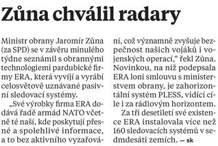 Ministr obrany České republiky Jaromír Zůna dnes v rámci svých cest po podnicích českého obranného průmyslu navštívil pardubickou společnost ERA. Firma ERA vyvíjí a vyrábí celosvětově uznávané pasivní sledovací systémy, které našly uplatnění i v Armádě České republiky (AČR).